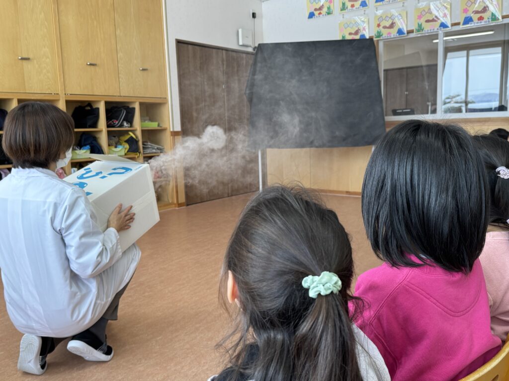 今日は年長児が、楽しみにしていた学研の化学教室のかがくタイムに参加しました。